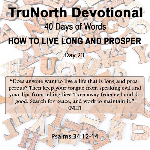 “Does anyone want to live a life that is long and prosperous? Then keep your tongue from speaking evil and your lips from telling lies! Turn away from evil and do good. Search for peace, and work to maintain it.” (NLT)