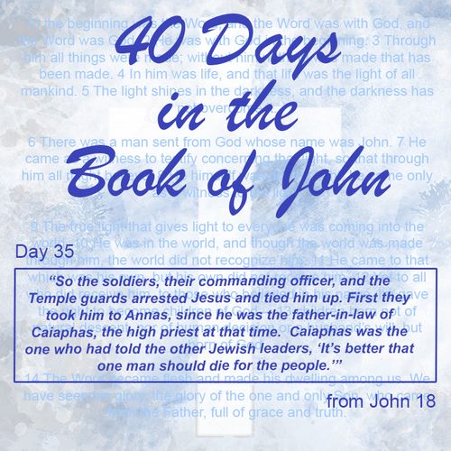 “So the soldiers, their commanding officer, and the Temple guards arrested Jesus and tied him up. First they took him to Annas, since he was the father-in-law of Caiaphas, the high priest at that time. Caiaphas was the one who had told the other Jewish leaders, ‘It’s better that one man should die for the people.’”